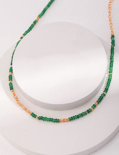 Created with 18K gold over sterling silver, the Evergreen Emerald Necklace features a gleaming gold chain adorned with vibrant, synthetic emerald gemstones. These stunning stones, with their deep, enchanting green hue, beautifully reflect the light and effortlessly draw admiring gazes.