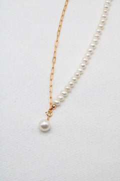 Crafted with 18k gold over sterling silver, our Link & Luster Pearl Necklace features a unique half paperclip gold chain and half pearl strand design. Gracefully combined, these elements create a visually stunning and versatile piece that is simply irresistible. Lined with lustrous freshwater pearls, each necklace is adorned with an exquisite touch that can only be found in nature.