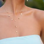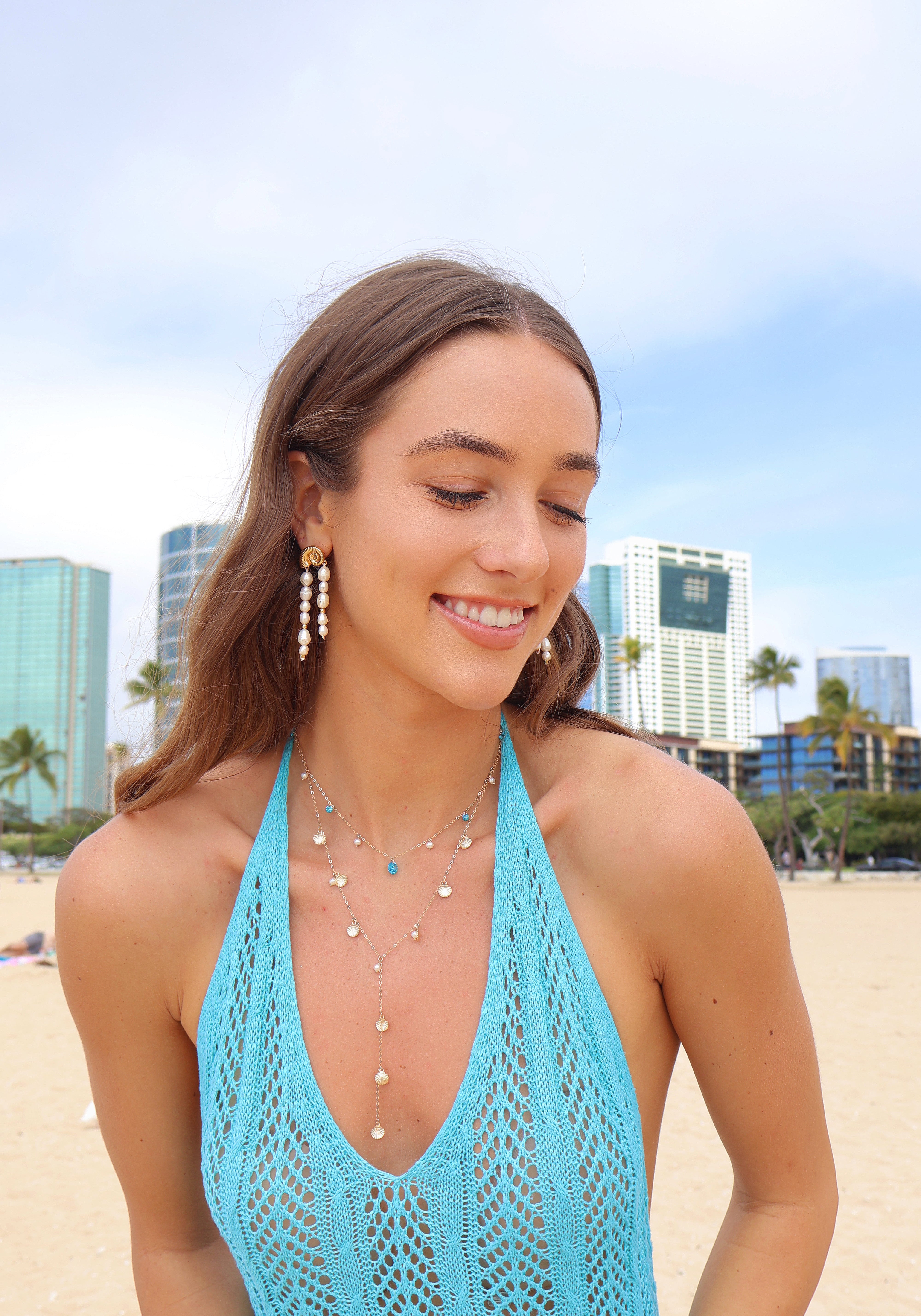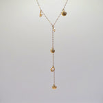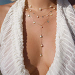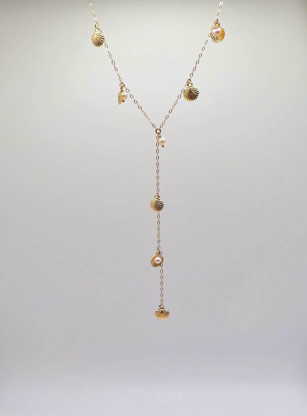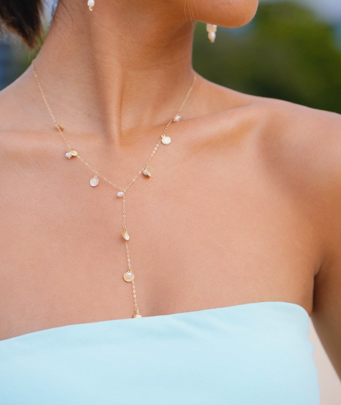 The Maris Drop Necklace brings effortless elegance with a dainty Y-drop design, flowing like the tides. A 14k gold-filled chain shimmers with golden shell charms, while freshwater pearls add a soft, luminous touch—each one unique, like the sea itself.