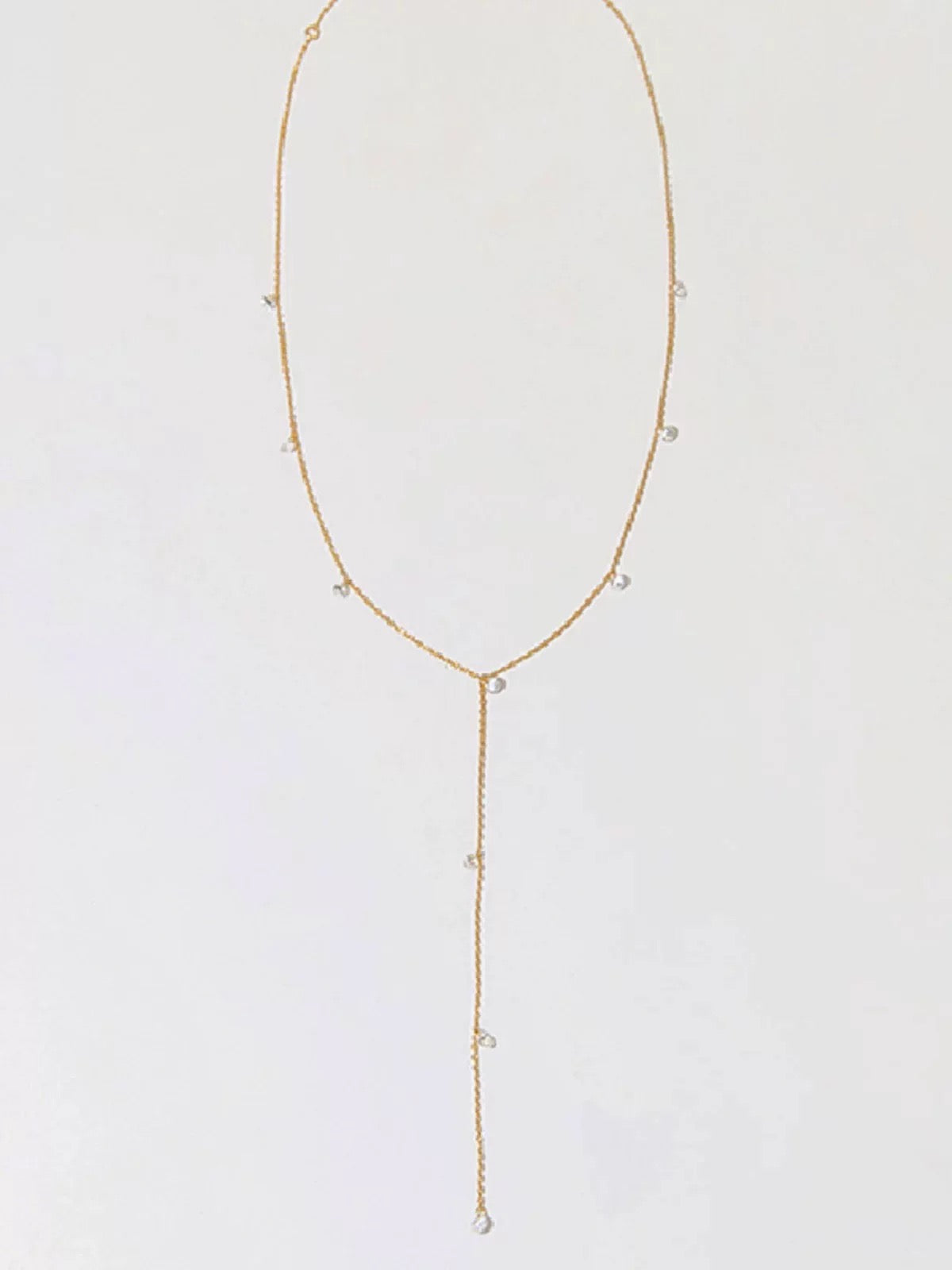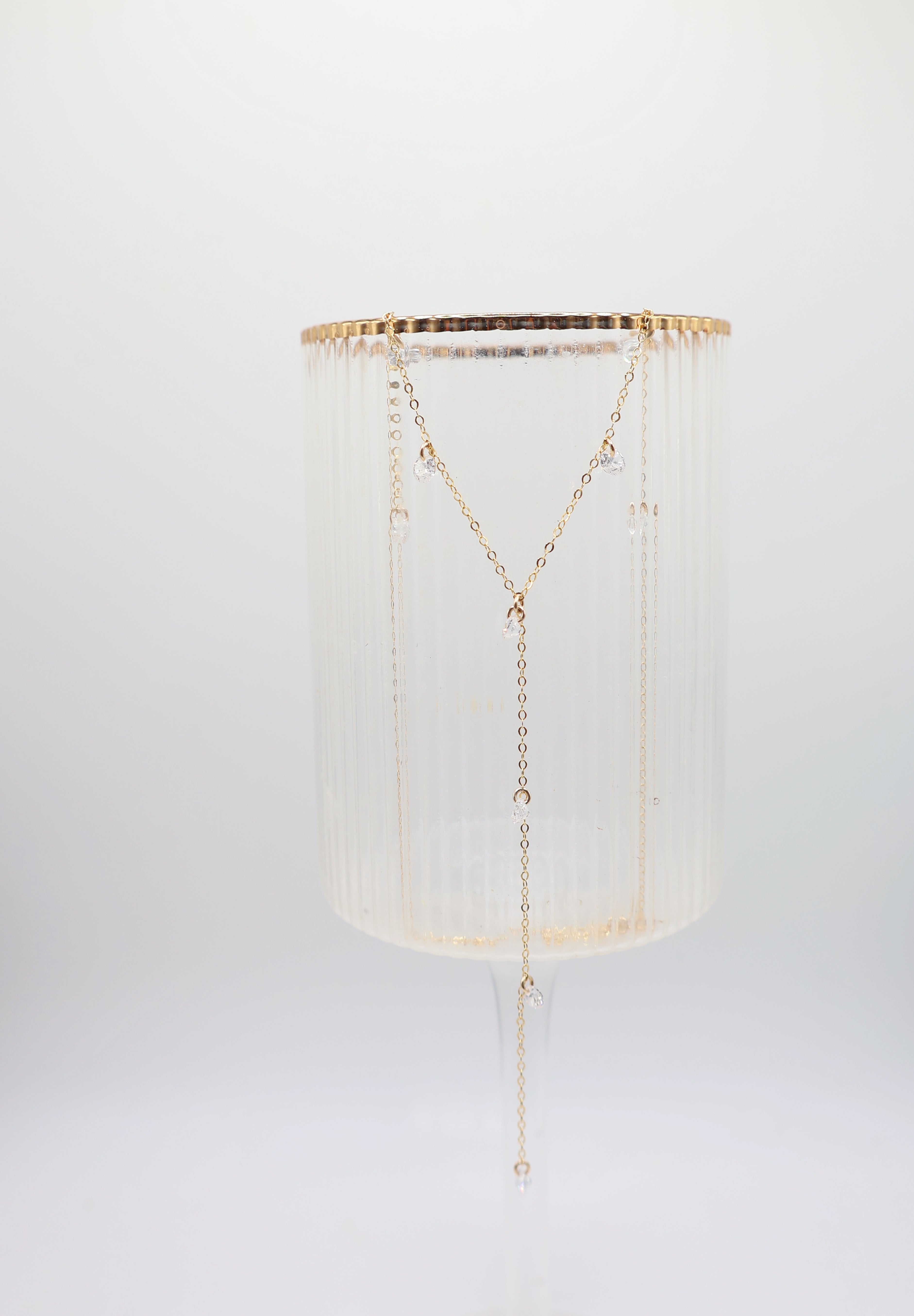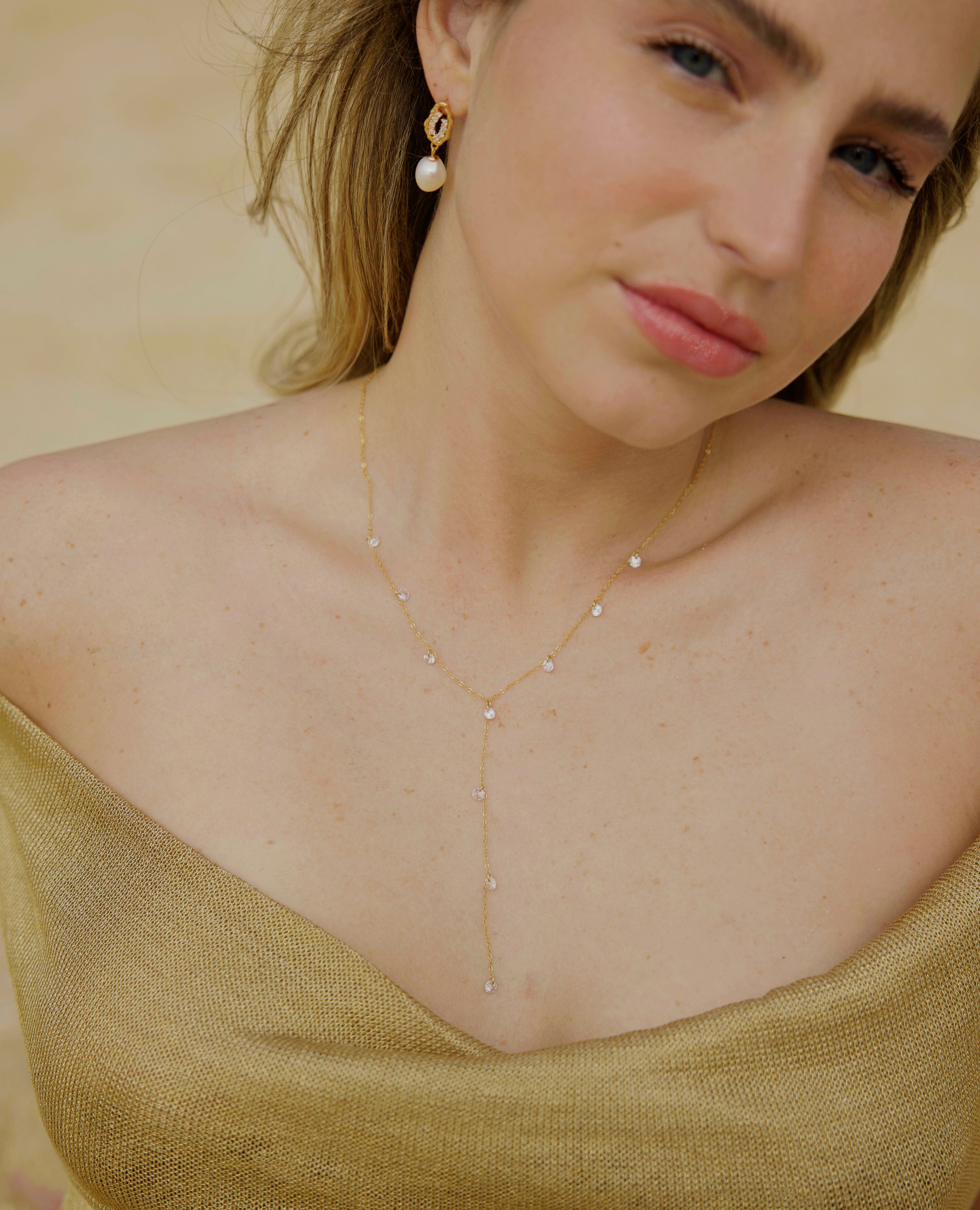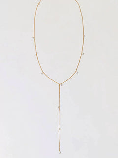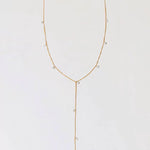 Soft, simple, and a little sparkly. The Solace Y-Necklace adds an easy glow to your neckline with its dainty gold chain and scattered CZ stones that catch the light in all the right ways. It’s effortless, minimal, and made for the days when you want to feel polished without trying too hard.
