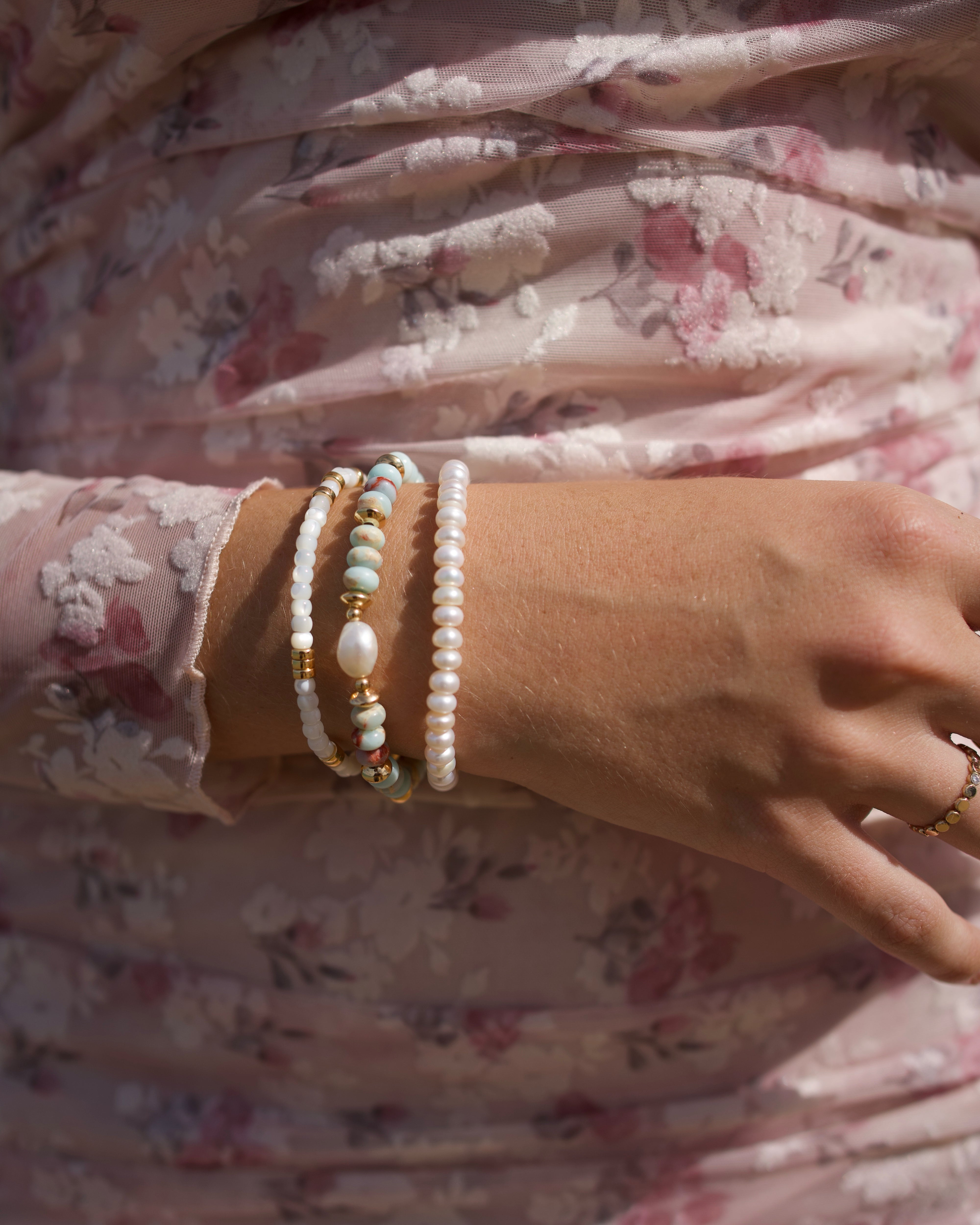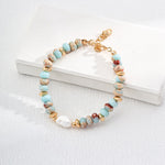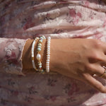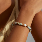 The Cloudline Bracelet brings the same serene balance of soft blue soapstone and radiant freshwater pearls — a subtle reminder of clear skies and quiet mornings. Finished with 18k gold over sterling silver, it’s effortless, airy, and made to layer.