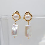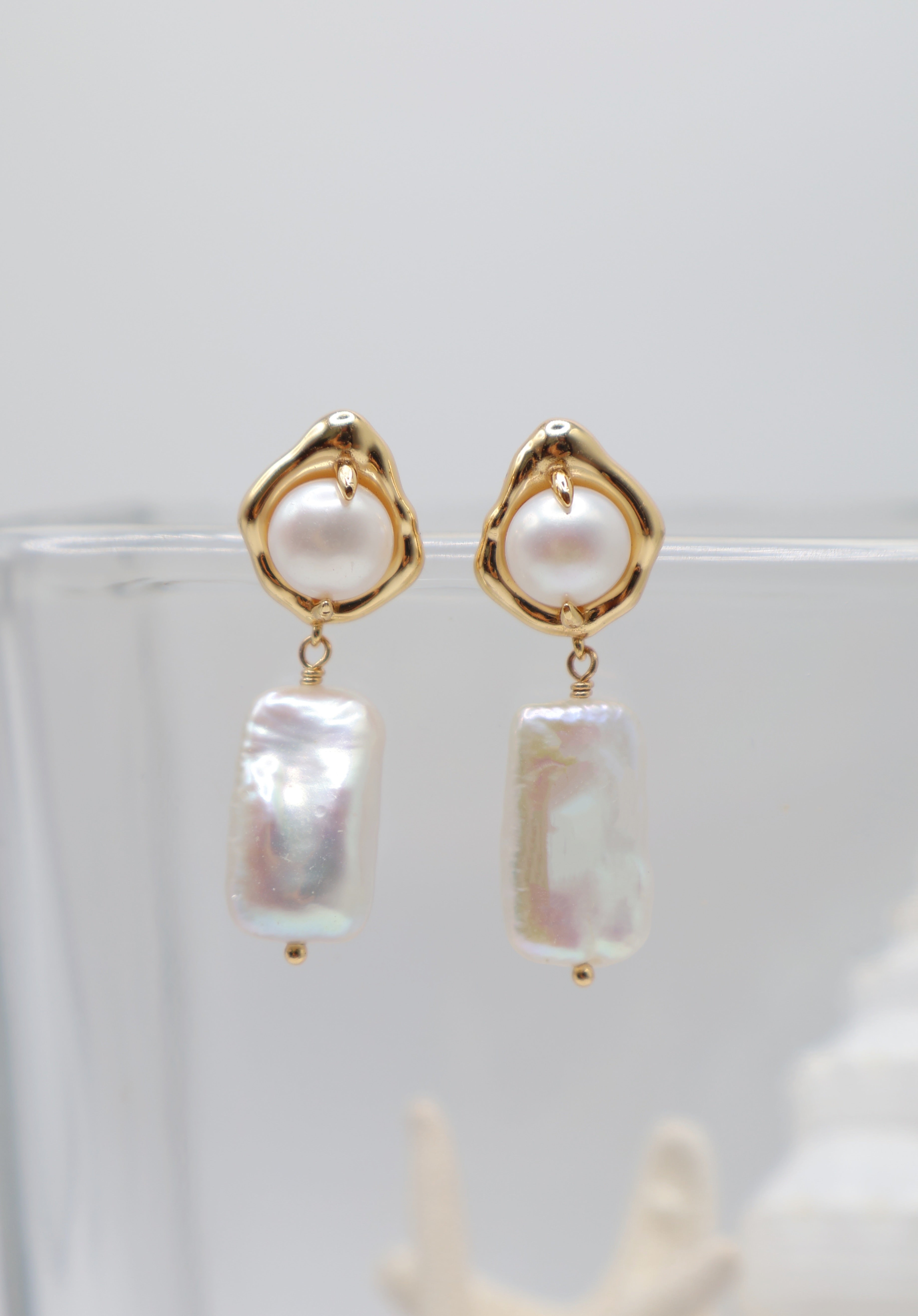 The Isla Drop Earrings blend soft curves and clean lines for a look that feels both timeless and fresh. A luminous freshwater pearl stud anchors a sleek mother-of-pearl rectangle, all set in radiant 18k gold over sterling silver.