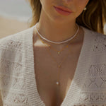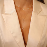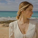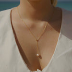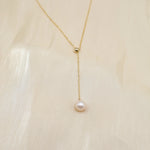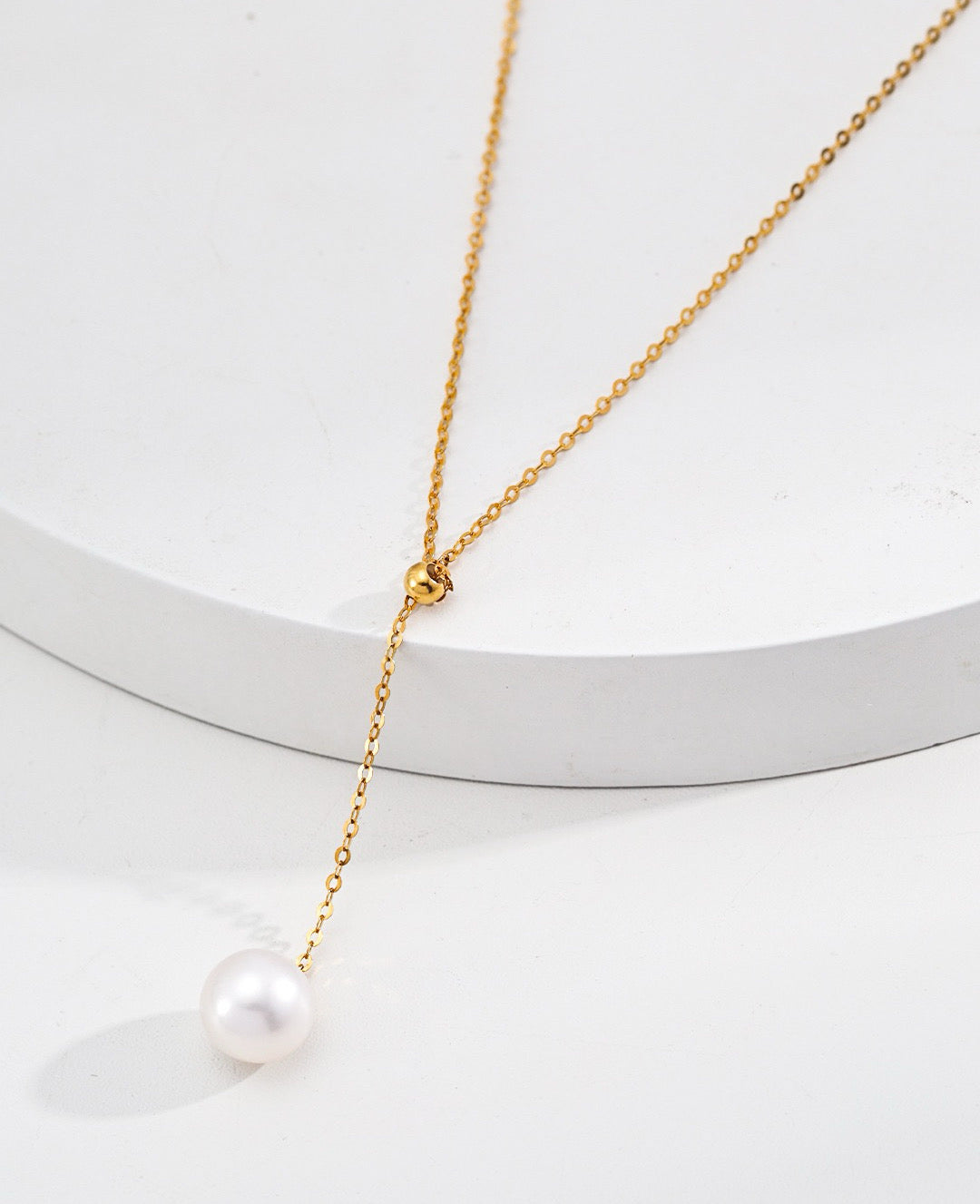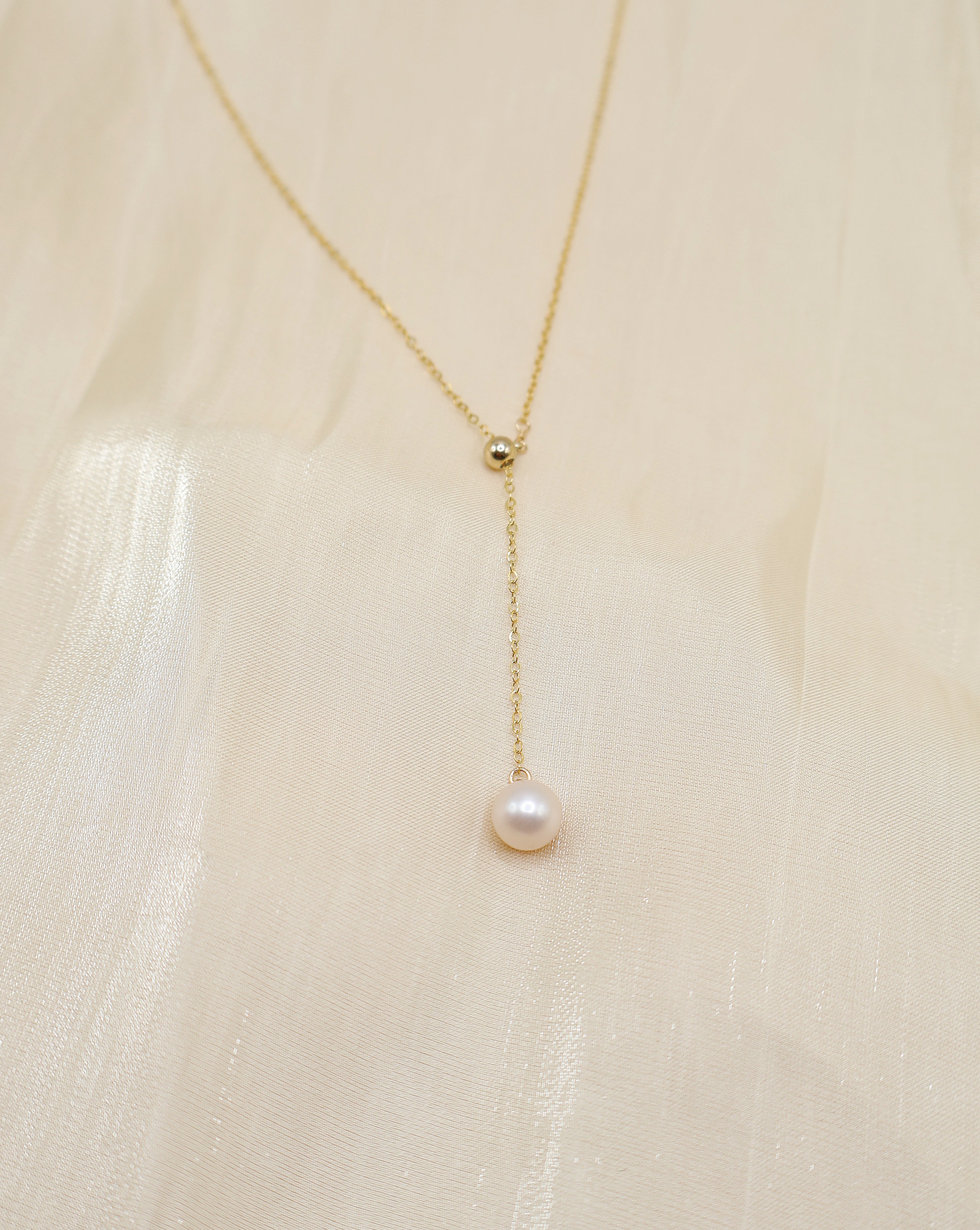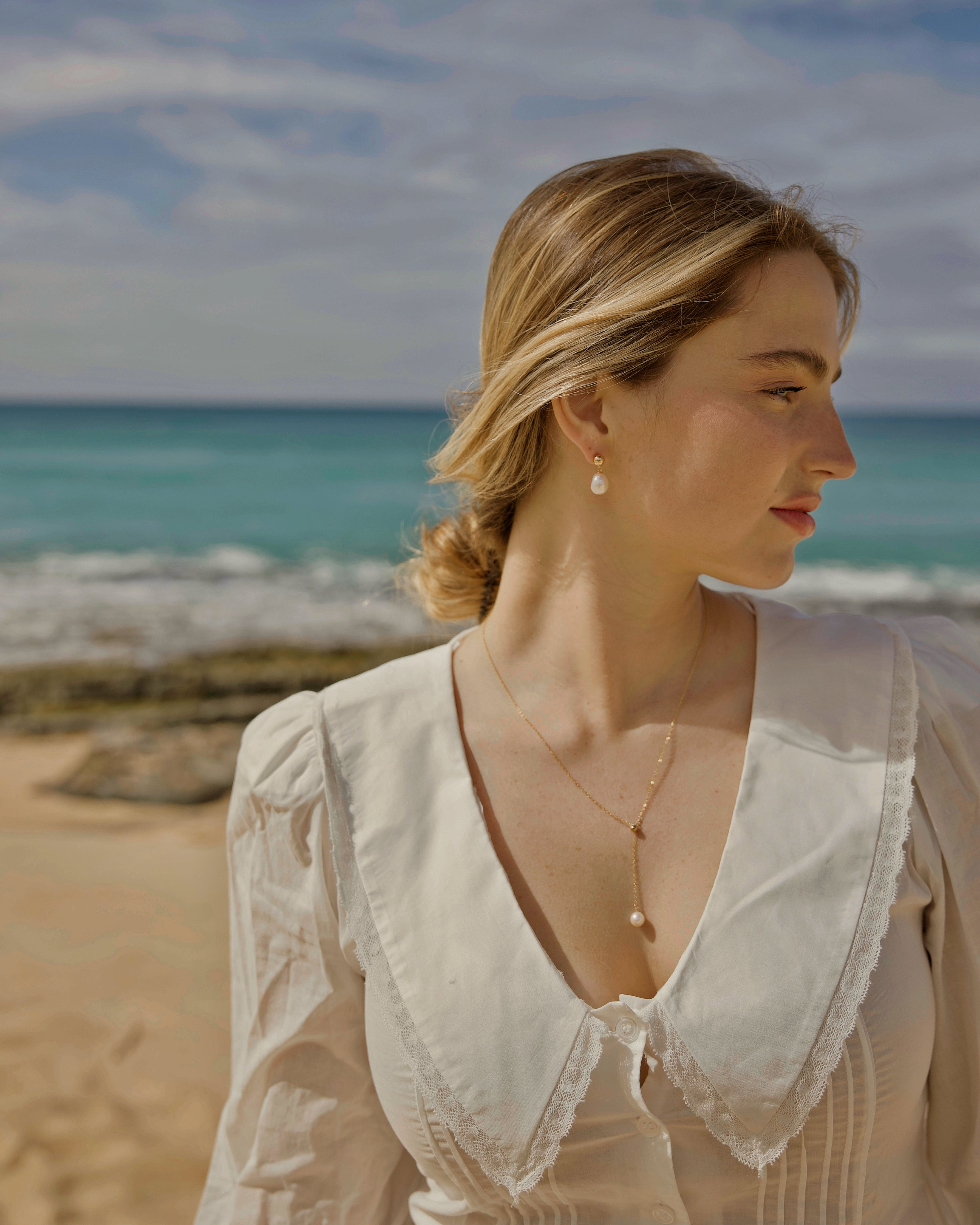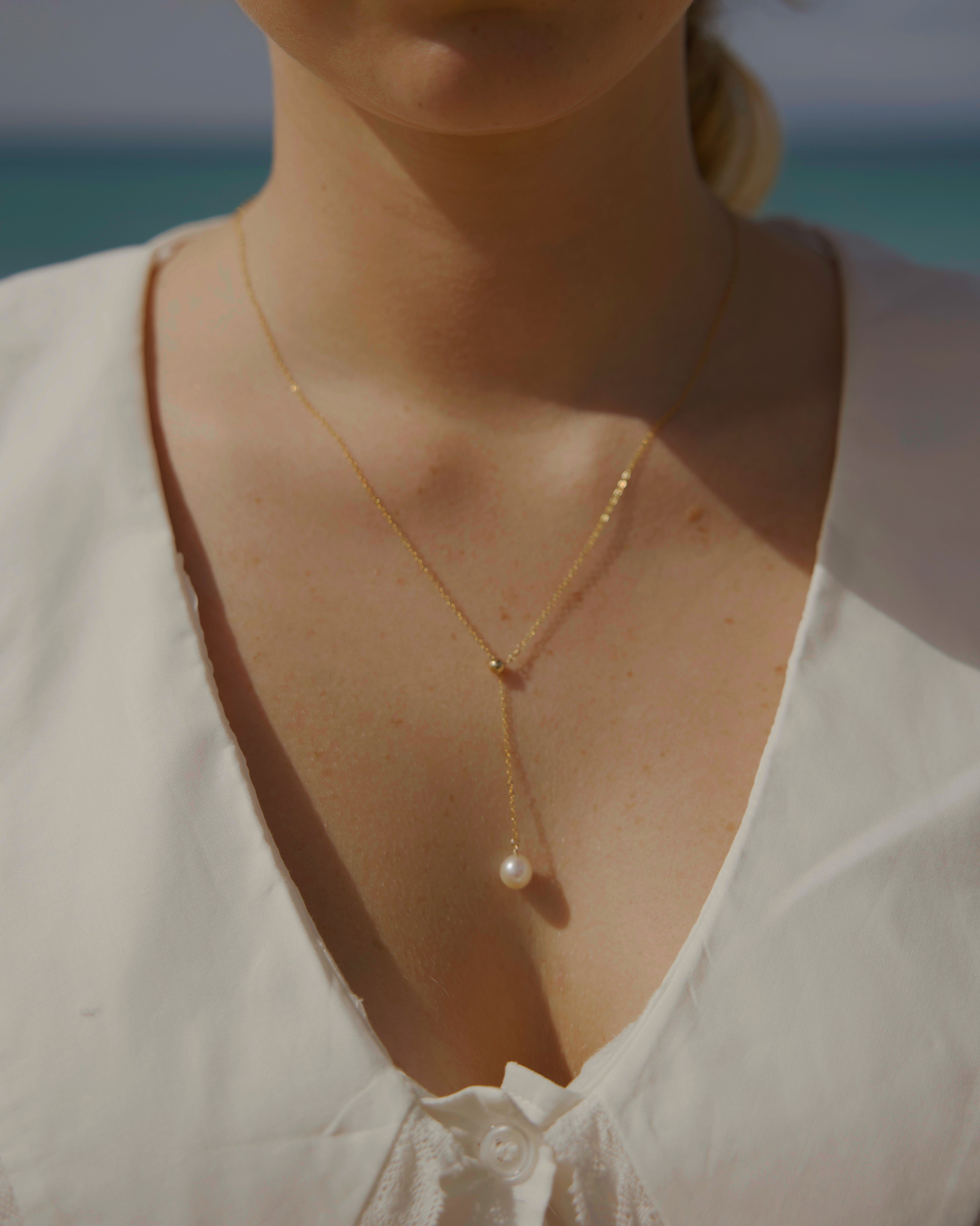 The Morning Pearl Drop feels light, effortless, and just polished enough. Designed in a delicate Y-drop silhouette, this piece features a single round freshwater pearl that sits perfectly at the center — soft, luminous, and easy to wear from morning plans into late dinners.
