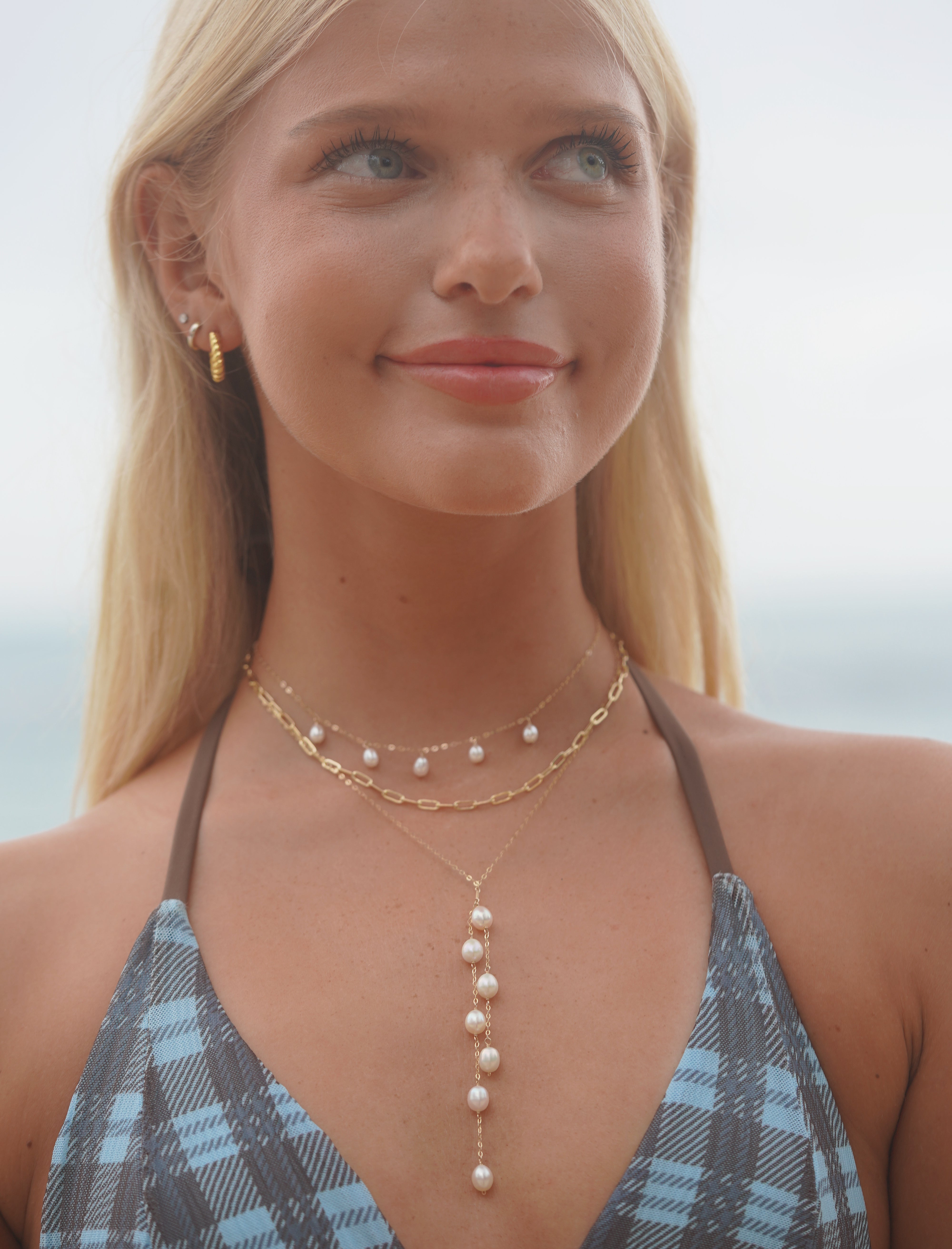 Meet the Gemini Drop Necklace — a luminous Y-style chain that pairs two lustrous freshwater pearls in a graceful cascade. Designed to catch the light (and compliments), this piece brings effortless elegance to any neckline.