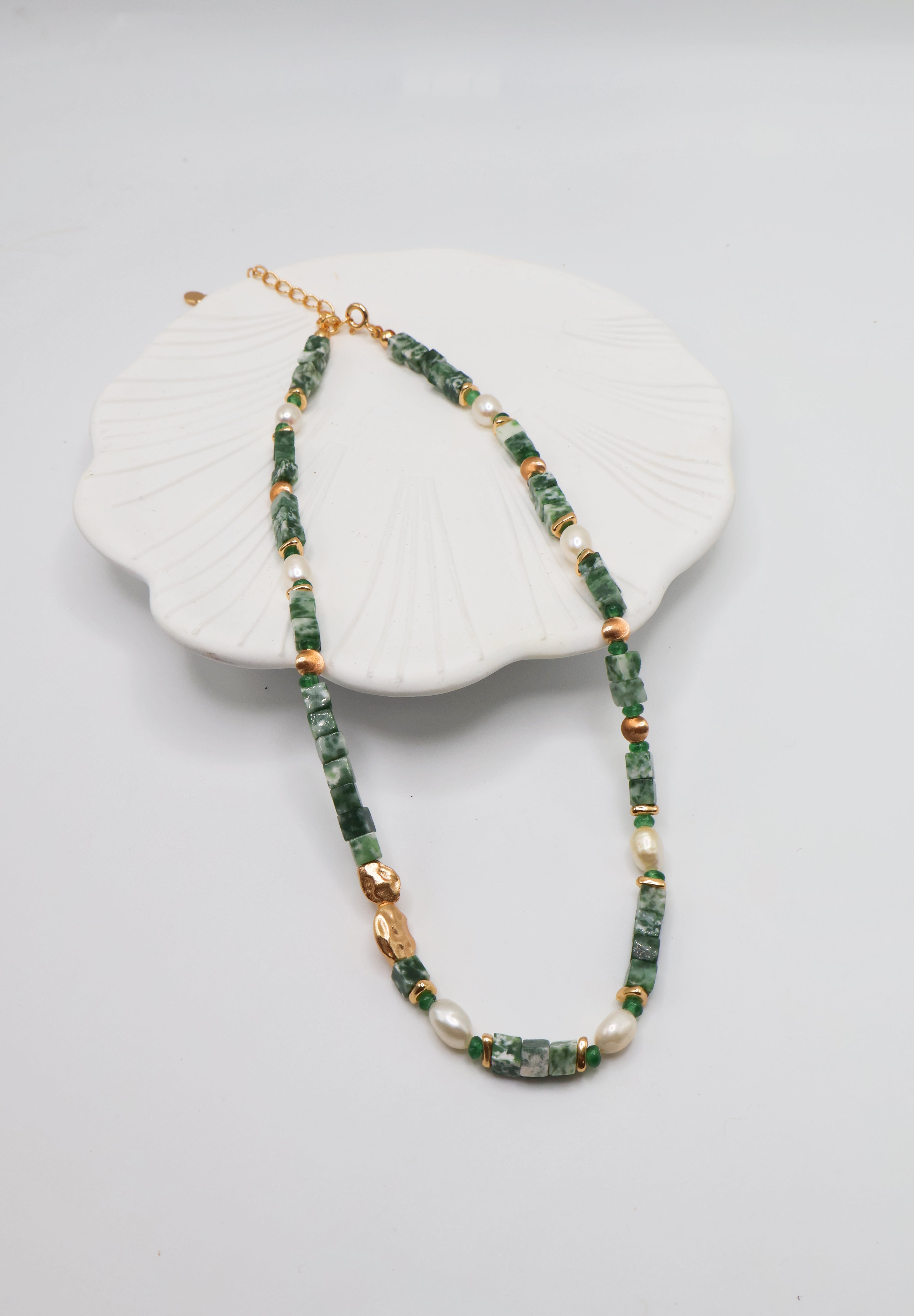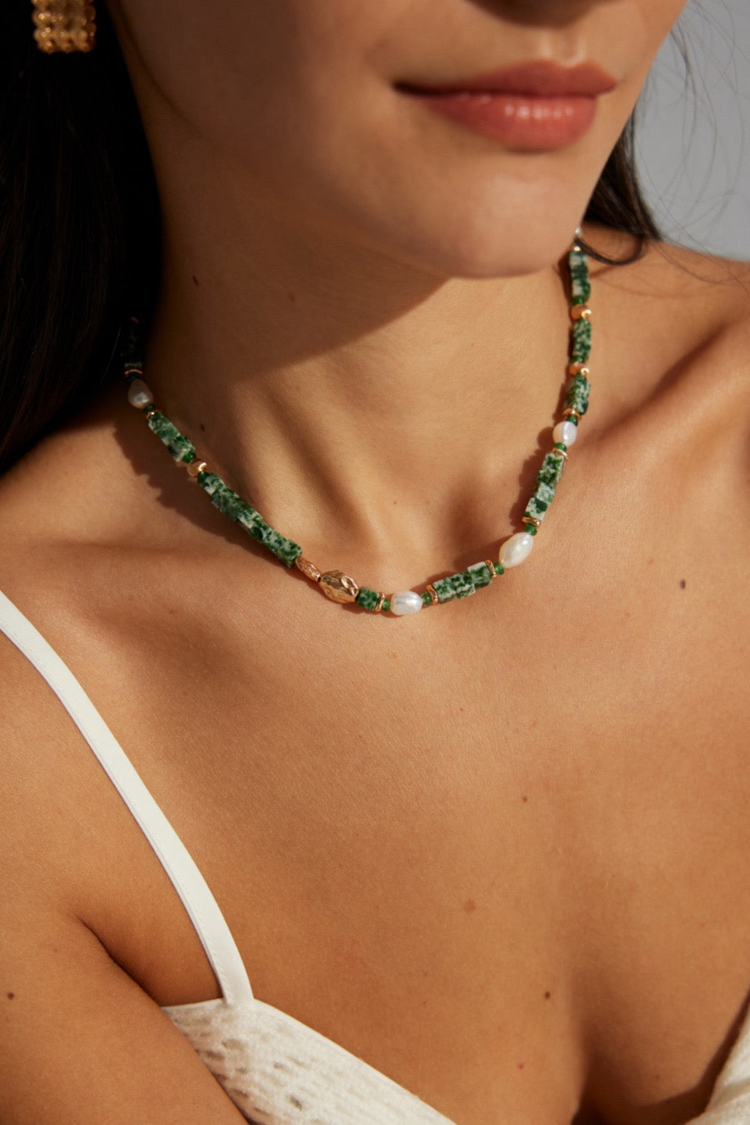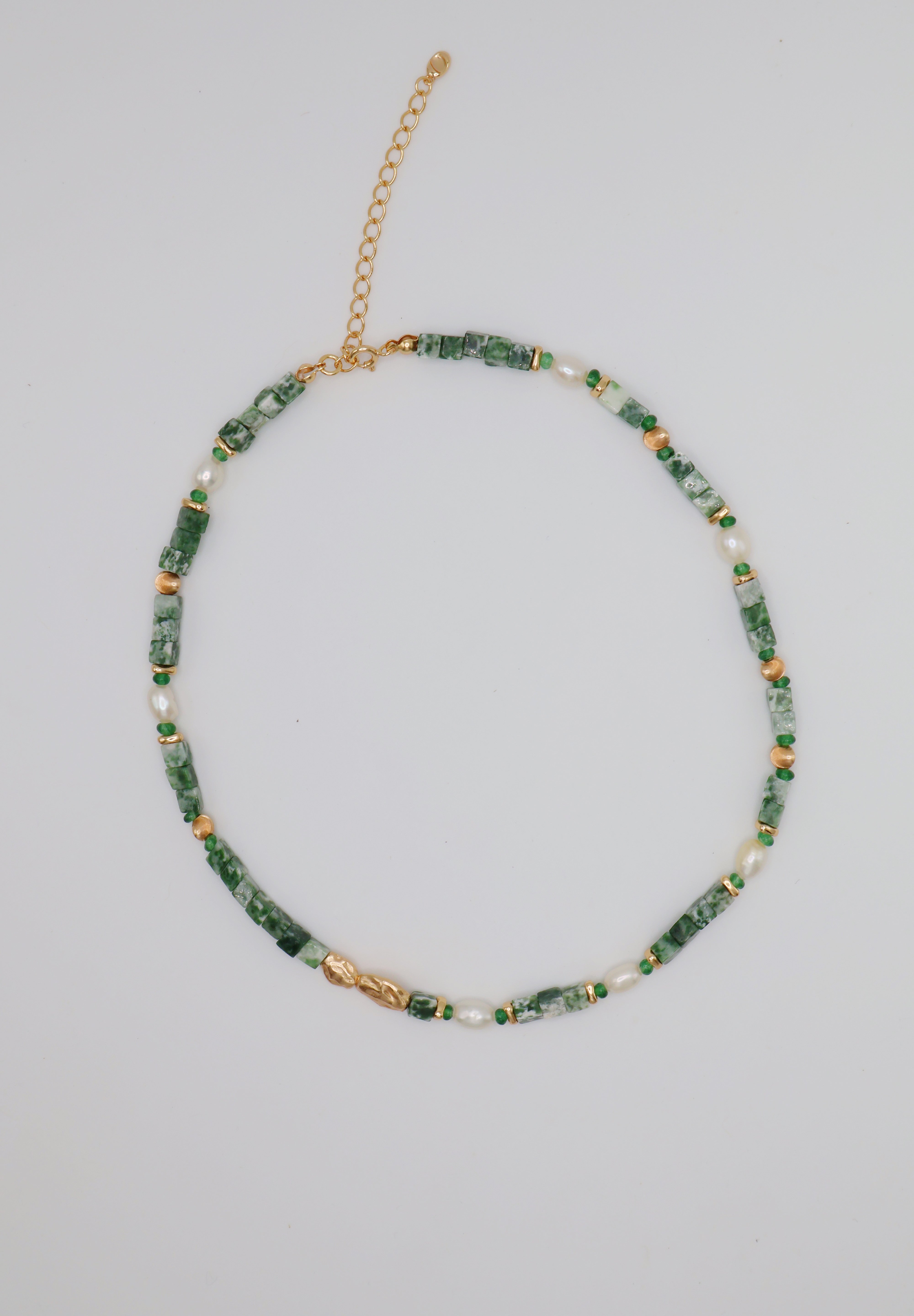 Meet the Jade Horizon Necklace – a fun mix of bold, square-cut jade stones, unique baroque freshwater pearls, and shiny 18k gold over sterling silver beads. This beauty brings a playful pop of color and natural charm to any outfit!