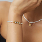 Introducing the Pearl Blossom Bracelet by Apelila Jewelry—a perfect fusion of classic elegance and delicate sparkle. This stunning bracelet features a strand of lustrous freshwater pearls, accented by petite blossoms of shimmering cubic zirconia nestled within an 18k gold-over-sterling silver band.
