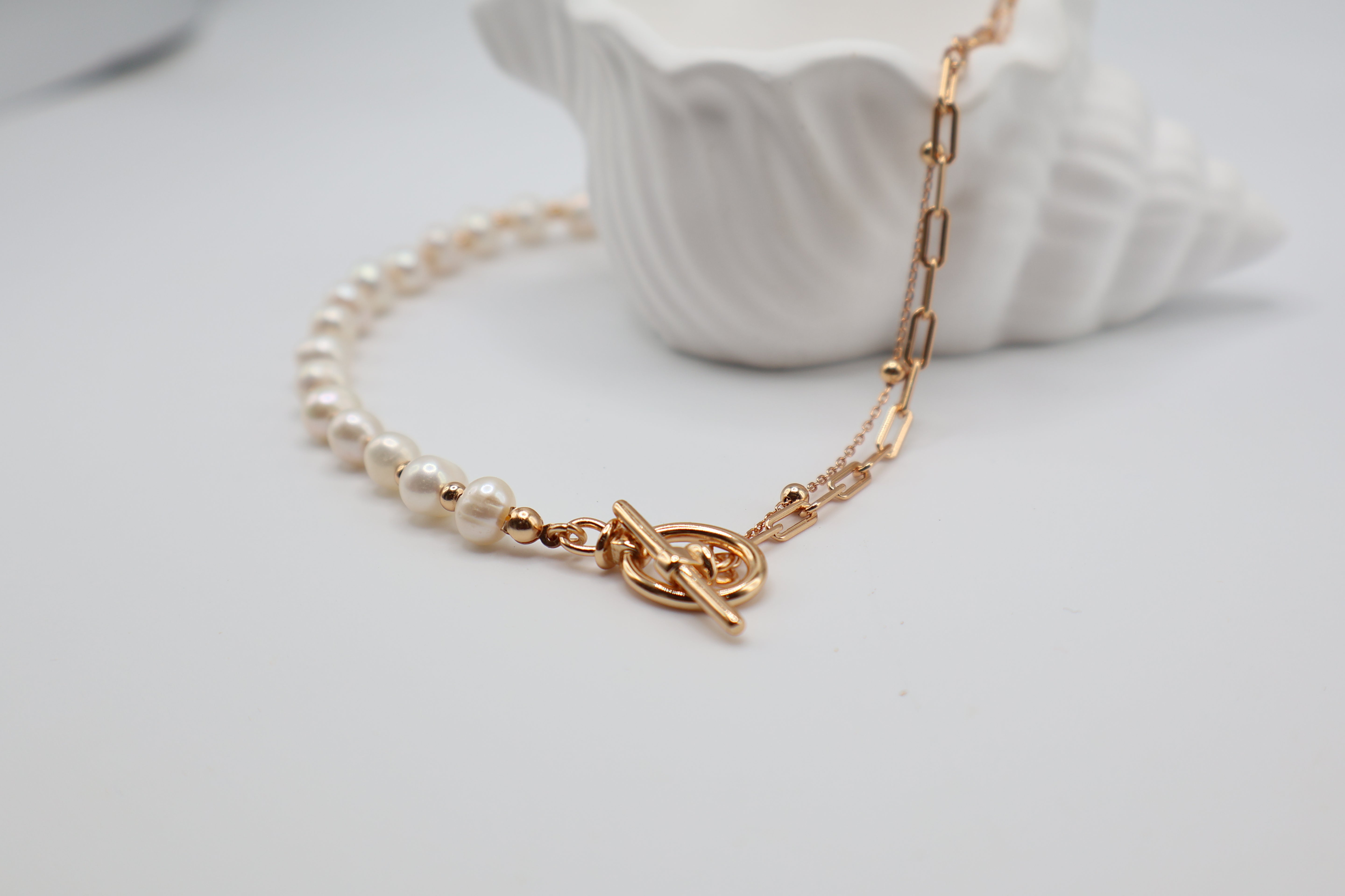 - Unique hybrid design: One half adorned with lustrous freshwater pearls and gold beads, the other half featuring a chic gold clip chain.