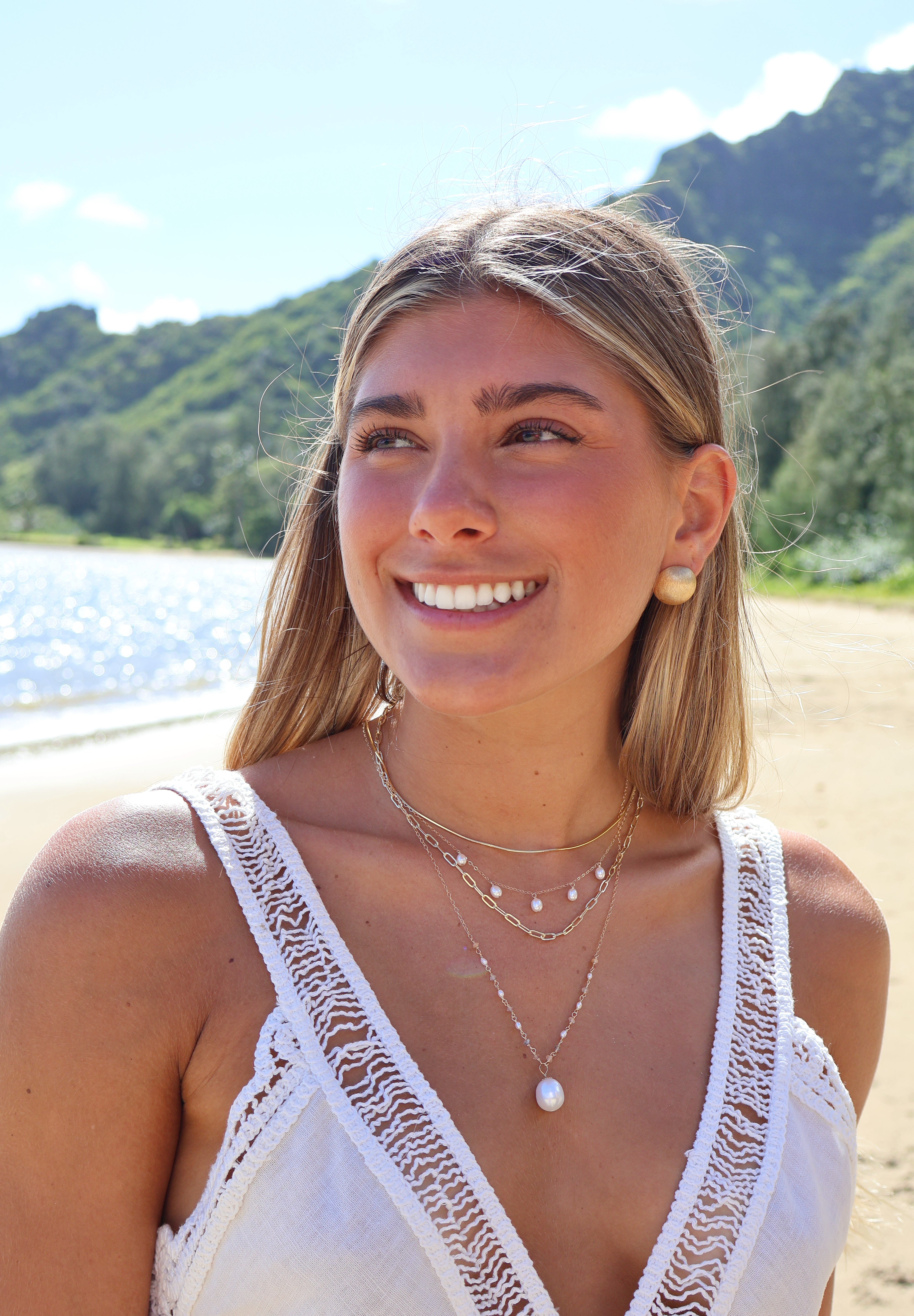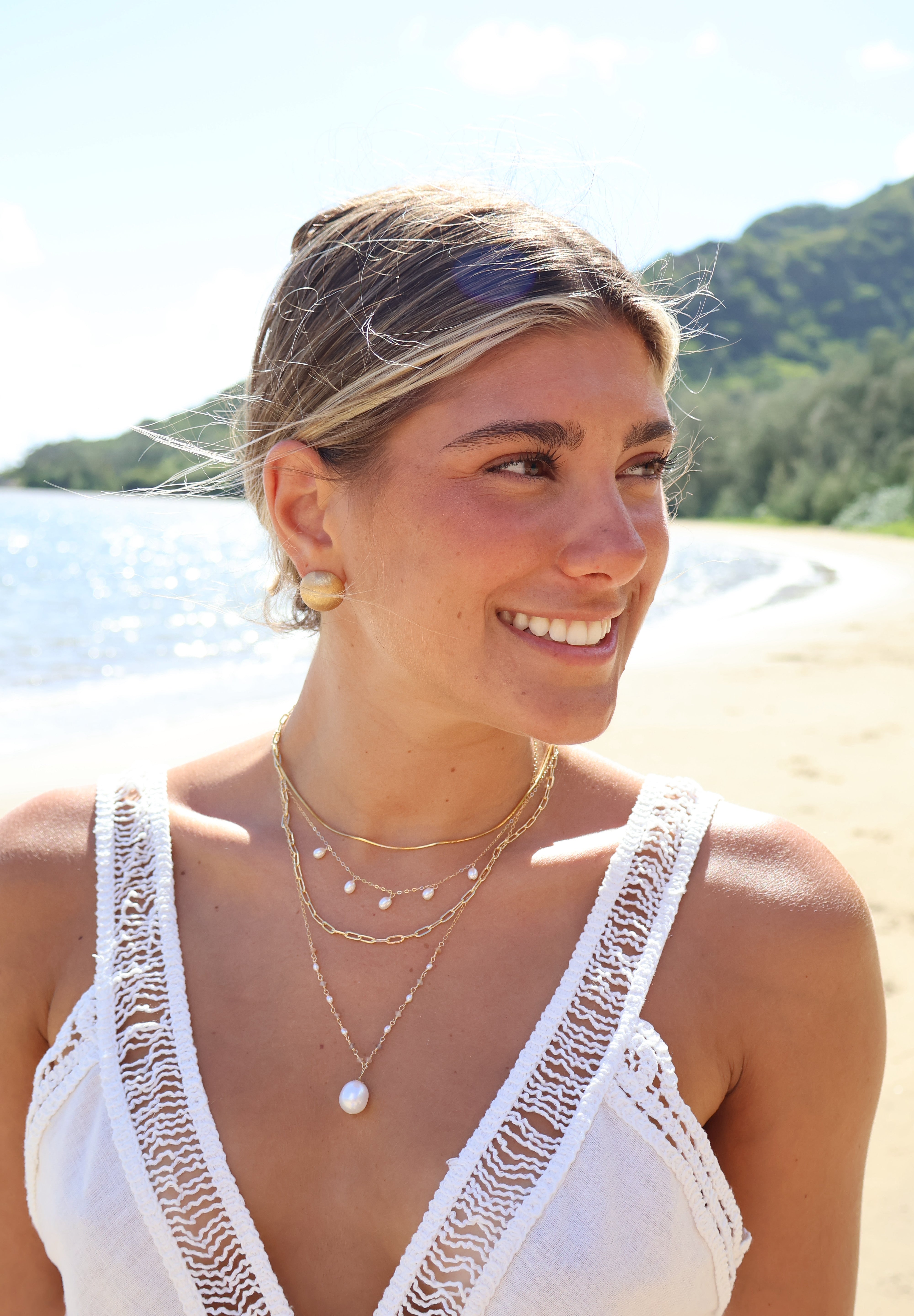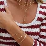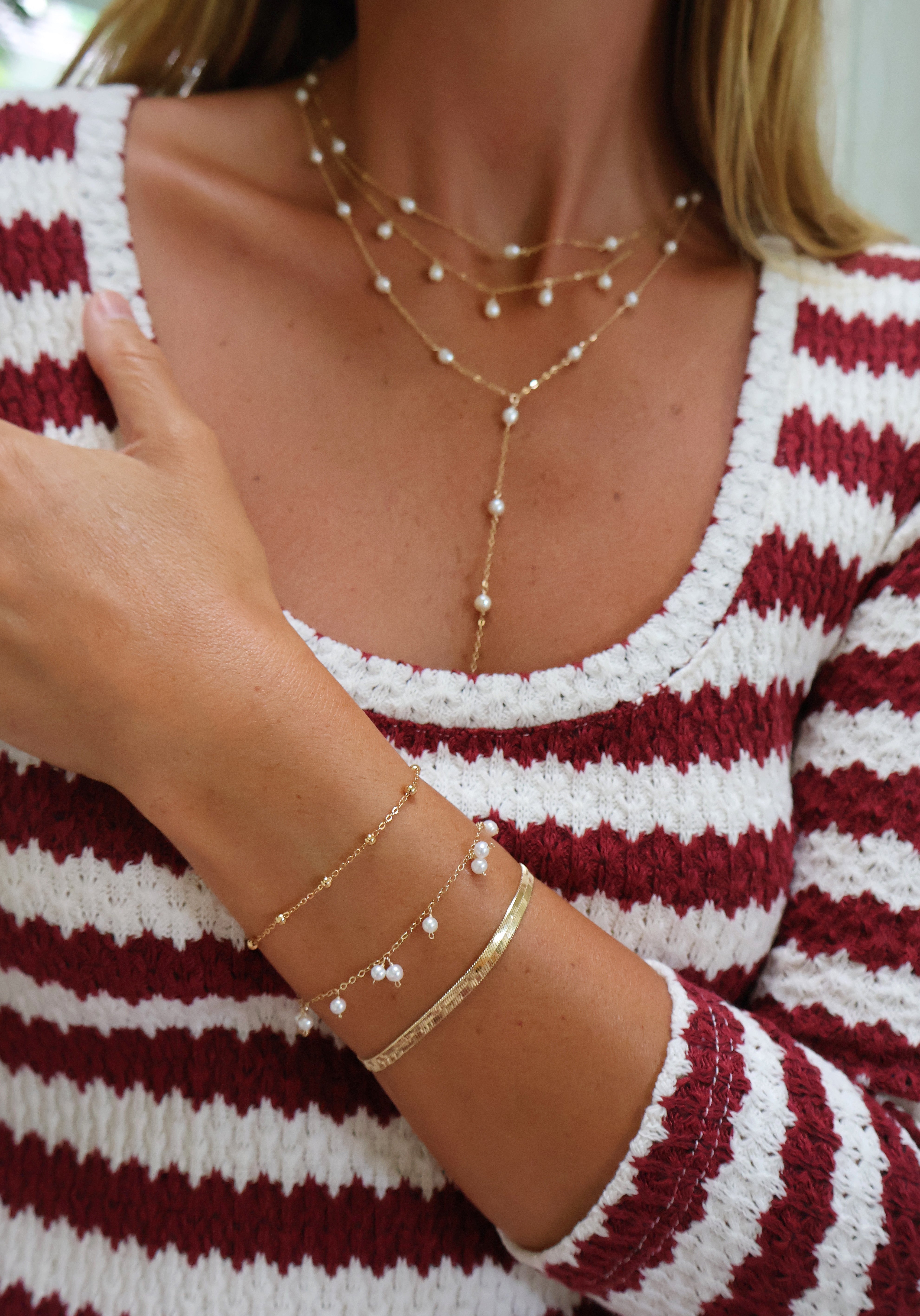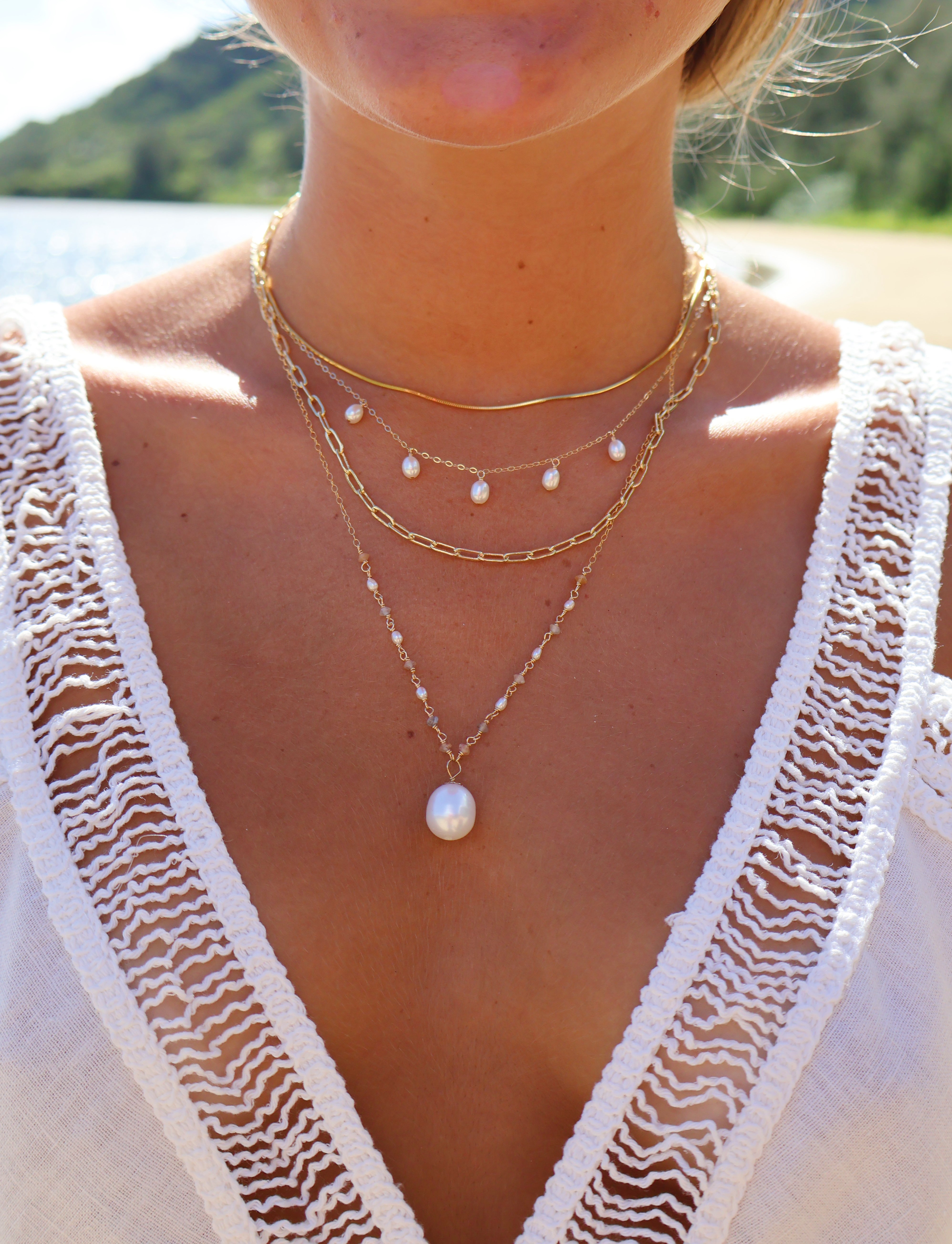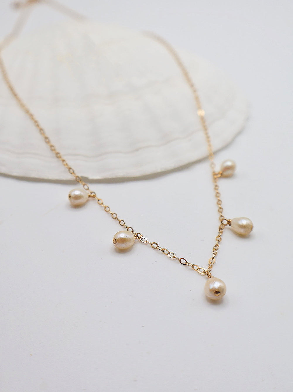 The Pearl Starlight Necklace is your everyday touch of elegance, featuring a delicate 14k gold-filled chain adorned with five luminous freshwater pearls. Perfect for layering or wearing solo, it’s a timeless piece that adds effortless charm to any look.