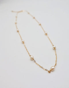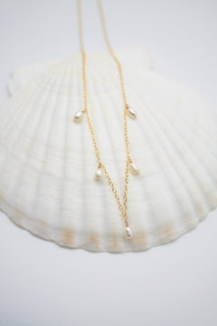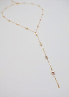 The Tranquil Y-Necklace takes timeless pearl jewelry to chic new heights. Featuring delicate freshwater pearls evenly spaced along a 14k gold-filled chain, this design flows into a graceful Y-shape with a single pearl drop. It's the perfect blend of classic sophistication and contemporary charm.