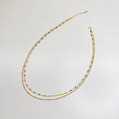 - Dual Chain Design: This necklace boasts a unique blend of sophistication and color, featuring two chains. One chain is a refined, simple 14k gold filled, while the other sparkles with small, colorful spinel gemstones.