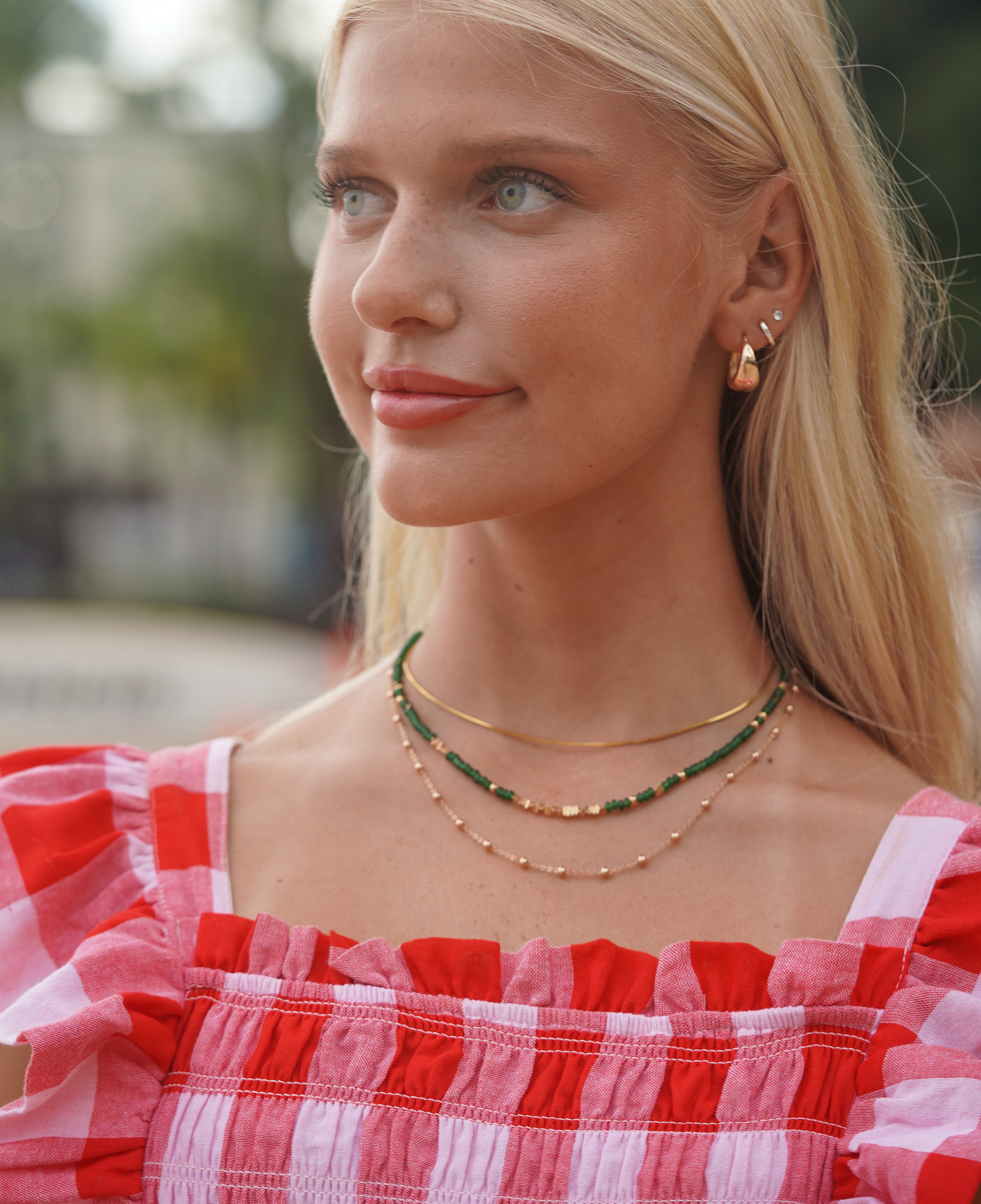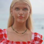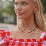 Created with 18K gold over sterling silver, the Evergreen Emerald Necklace features a gleaming gold chain adorned with vibrant, synthetic emerald gemstones. These stunning stones, with their deep, enchanting green hue, beautifully reflect the light and effortlessly draw admiring gazes.