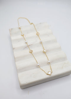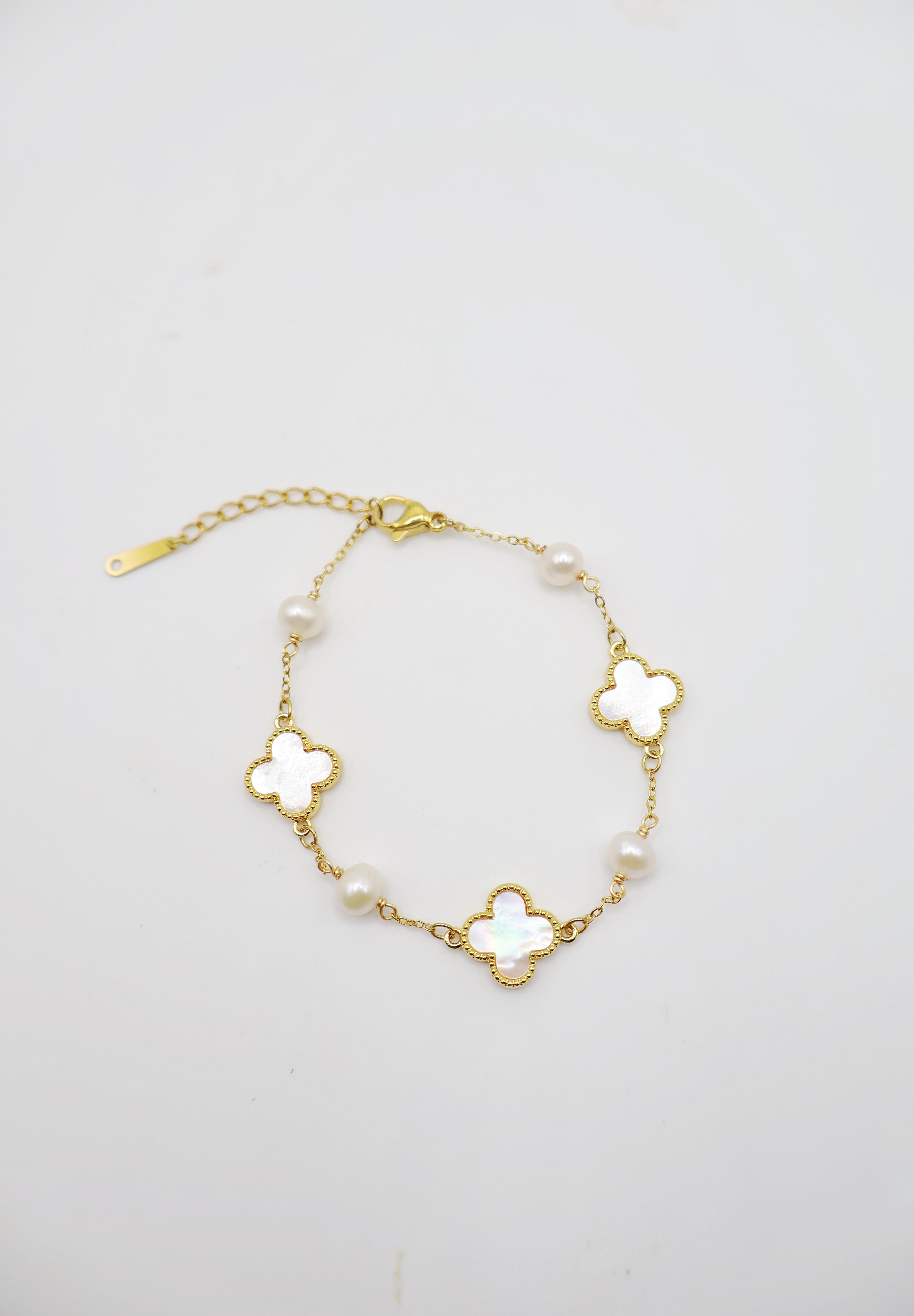 Delicate, luminous, and easy to wear — this bracelet brings together mother-of-pearl clovers and freshwater pearls for a look that feels both polished and effortlessly coastal 🌤️