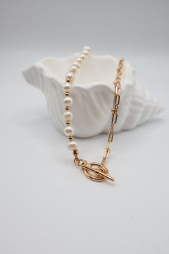 - Unique hybrid design: One half adorned with lustrous freshwater pearls and gold beads, the other half featuring a chic gold clip chain.