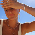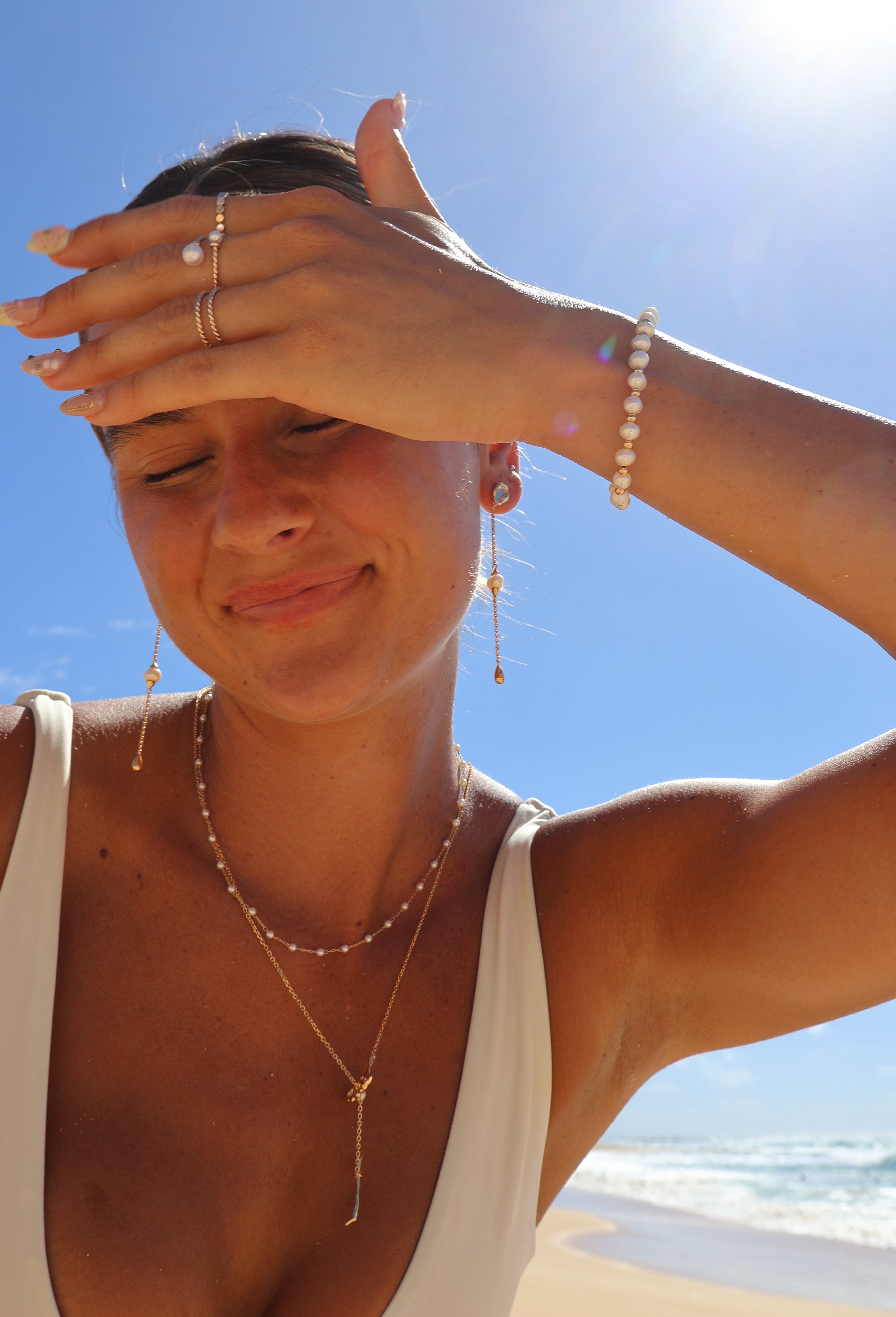 The Seasong Necklace is designed to move with you. This adjustable lariat features a sculpted gold shell detail accented with a freshwater pearl, creating a soft cinch effect that lets you style it higher or lower depending on the moment. Easy, organic, and just statement-enough.